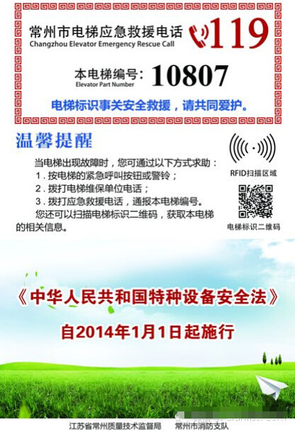 随着常州市“政府为民办实事工程——电梯应急救援平台建设”的顺利推进,常州市每台乘客电梯都将张贴一张温馨提示,内容包括电梯唯一识别码和三种求救方式提醒:按下紧急报警装置通知使用单位、用手机拨打该电梯的维保单位救援电话,也可拨打全市统一的电梯救援电话119并报出电梯5位识别码。119接警中心人员接警后,即通过电梯五位唯一识别码,迅速定位故障电梯位置,通知法定救援单位救援解困。解困完毕后,救援人员必须反馈信息。