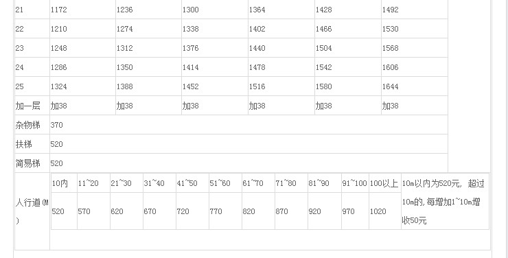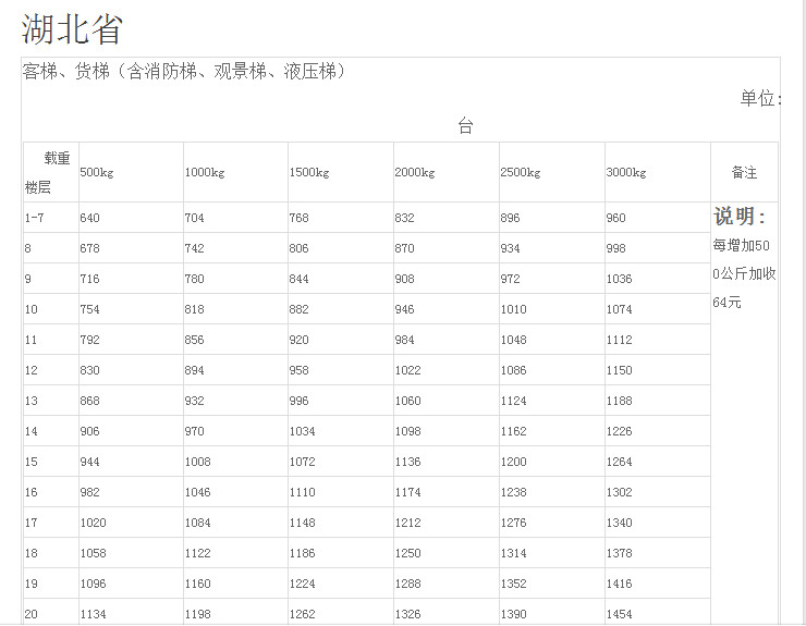 1.电梯(含液压梯)收费基数为640元,每增加一层加6%,每增加500KG加10%.