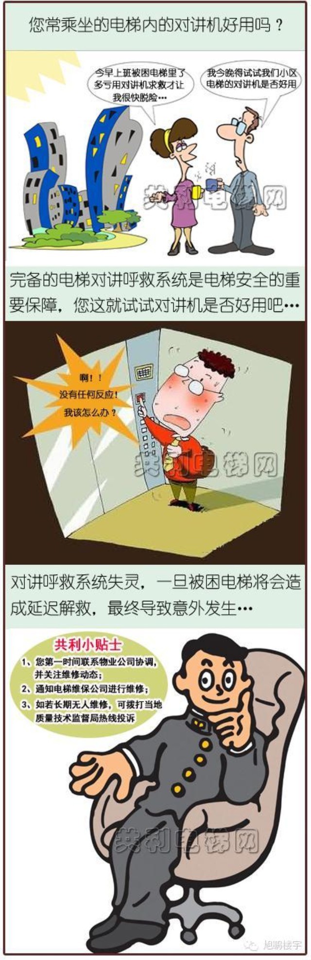 所谓“未雨绸缪”“防患于未然”,电梯用户们请大家赶紧去测试一下您乘坐的电梯内的对讲机是否好用,这并不是无聊的消遣,而是给自身安全加装一道有效保护。