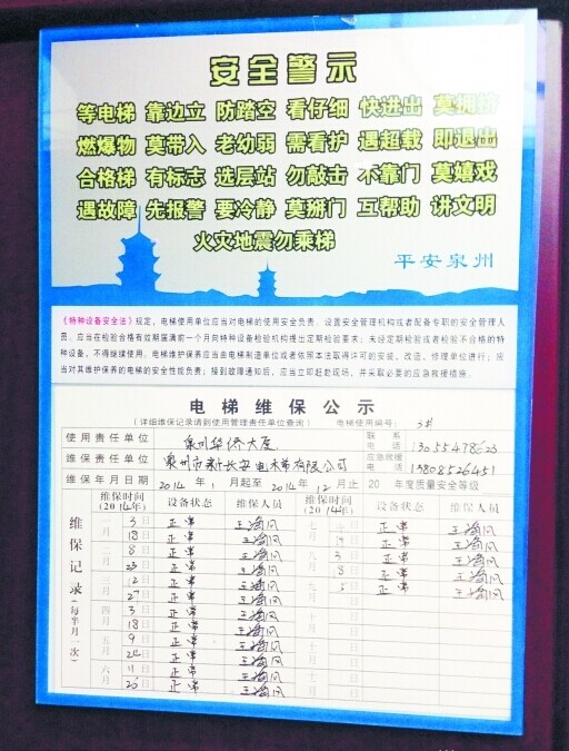 其实,早在2012年,泉州就已开始进行电梯维保公示的试点工作,目前全市有近400台电梯已经进行维保信息公示。在部分小区、机关单位和公共场所的电梯内,市民们已经能看到半个月更新一次的维保公示卡。
