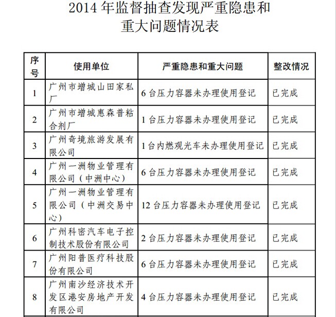 30日,广州市质监局官网公布2014年特种设备使用单位监督抽查情况,发现存在有严重隐患和重大问题的单位有 10 家,已分别对其采取责令整改或立案查处的措施。目前,存在的问题已整改完毕,事故隐患已及时消除,设备安全运行得到保障。