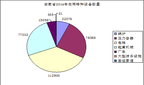 截至2014年底,全省在册特种设备数量303709台,(不含压力管道与气瓶),比上年增长18.0%,低于上年的增幅18.7%。其中:锅炉22076台,比上年减少0.5%;压力容器76066台,比上年增长14.1%;电梯112903台,比上年增长28.1%;起重机械77032台,比上年增长14.4%;厂内专用机动车辆15056辆,比上年增长19.1%;大型游乐设施555台,比上年增长8.8%;客运索道21条,与去年持平。另有气瓶4928989只,比上年增加8.7%;压力管道7638.64千米,比上年增长13.6%。