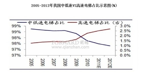 尽管受房地产调控政策影响,电梯直接下游产业房地产市场回落,但电梯行业依然保持稳步增长的态势。前瞻产业研究院电梯行业研究小组预计,到2015年我国电梯产量有望突破75万台/年,较目前翻倍,其增长速度保守预测在20%左右。