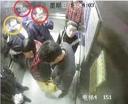 两名男子(用红圈标记)把受害者(用黄圈标记)挤在电梯角落行窃。监控视频截图