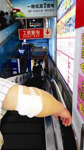 昨日,市民马先生称在这部扶梯上摔倒受伤。本报记者杨自林 摄原标题:一个说抖了 一个说没抖男子电梯上摔伤缝三针事发城区CBD 事故原因涉事双方各执一词市质监局专家称此类电梯因故障自动停止后,要重启才会运行。