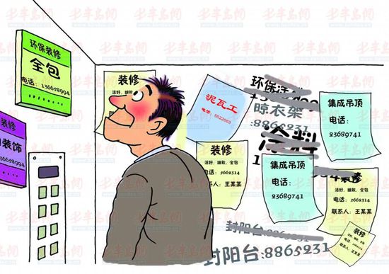 这让我认识到,电梯里的这些广告,绝不是没有作用的。以后,广告一天比一天多起来了,有封阳台的、有做门的、有做集成吊顶的、有做大理石的、淋浴房的、橱柜的,还有做晾衣架的,就连回收纸盒、废品,清运垃圾的小广告都有。小小的电梯里,足可以组建一个装修公司。