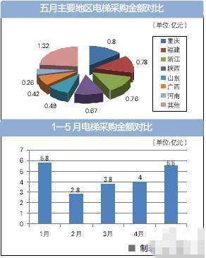 5月,电梯采购迎来新一轮采购高潮。据《政府采购信息报》不完全统计,全国公开招标电梯项目约320个,采购金额5.5亿元,相比4月的4亿元增长37.5%。