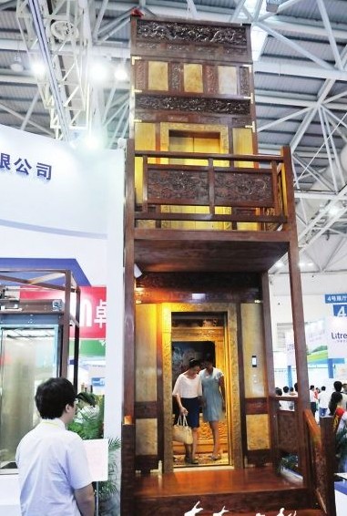 在展馆里,一部金碧辉煌的电梯,让不少参观者驻足留念。被誉为梯王的这部电梯外围和轿厢装饰采用中国古建筑皇家专用的金丝楠木,连电梯的门板采用的都是整块金丝楠木。