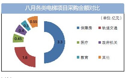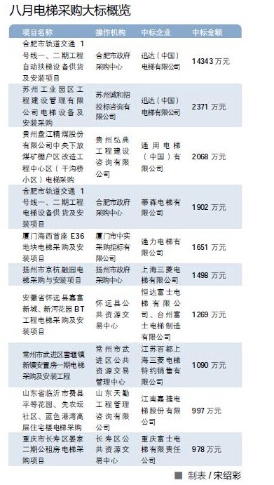 医院、学校、法院、科技馆和福利院等项目全面发力也为8月电梯采购增色不少。比如,浙江省湖州市中心医院电梯项目,中标金额967万元;贵州省毕节职教城六所院校、毕节一中和实训基地电梯采购,中标金额678万元;山东泰山社会福利中心一期工程电梯项目,采购金额552万元;东营市中级人民法院审判综合楼电梯设备,采购金额接近300万元。