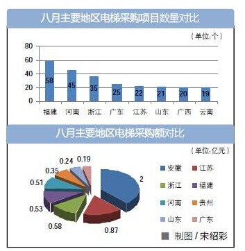 江苏省电梯采购规模8700万元,仅次于安徽省;其次是浙江省,采购金额5800万元;福建省采购项目最多,共计58个,采购规模排在全国第四,金额为5300万元。