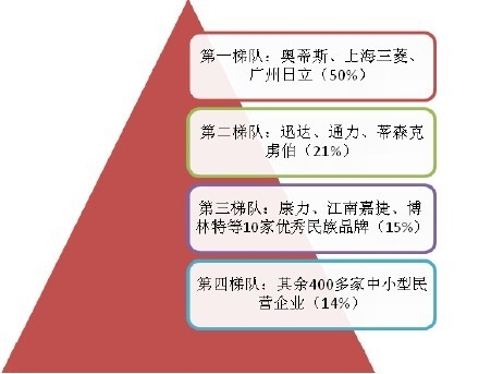 国内电梯销售市场呈现出金字塔形竞争格局,形成了四大梯队:第一梯队为三家合资大厂,主要是奥的斯(OTIS)、上海三菱、广州日立,三家三足鼎立。其中,上海三菱、广州日立的产品主要定位于中高端,定位较为重合,而奥的斯主要定位低端产品,竞争不大。第二梯队为十几家合资企业,主要是迅达、通力、蒂森克虏伯、东芝、富士达等,约占21%的市场份额。第三梯队为康力、江南嘉捷、博林特、广日电梯、苏州申龙、京城中奥、山东百斯特、沈阳三洋、辽宁富士、许继电梯等10家优秀民族品牌,约占15%的市场份额。像康力等产品的定位也为中高端,但目前才刚刚铺好网络,销售量和存量还很有限。第四梯队为除去10家优秀民族品牌的400多家中小型民营企业,约占14%的市场份额。民族品牌呈现一定的集中度,康力电梯等十大民族品牌占据了民族企业市场份额的50%。国内市场相对需求量不大的高端电梯产品均被外资品牌垄断,基本依赖进口。