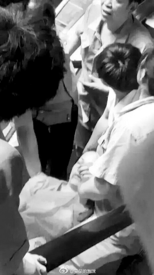 迹,商场的保安人员在一旁搀扶着伤者,并拨打电话求救。