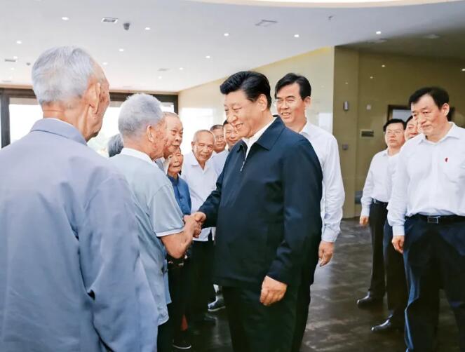 2019年5月20日至22日,中共中央总书记、国家主席、中央军委主席习近平在江西考察,主持召开推动中部地区崛起工作座谈会并发表重要讲话。这是习近平在赣州市于都县中央红军长征出发纪念馆会见于都县的红军后代、革命烈士家属代表。新华社记者 鞠鹏/摄