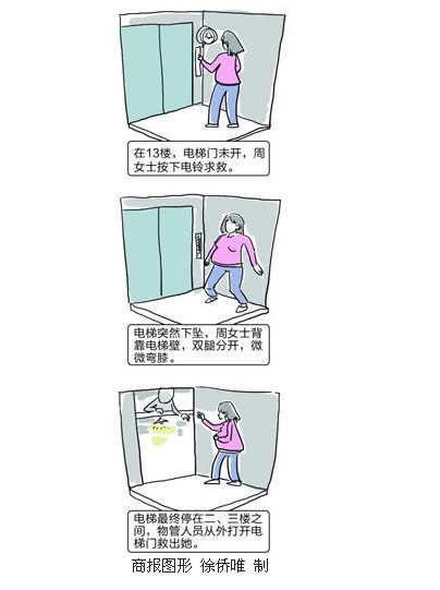 九龙坡区消防部门就此说,周女士在此次事故中的应急处理是妥当的,电梯突遇故障,在不知是什么原因的情况下,最好不要去随便按钮。电梯里一般都有“警铃”、维保电话,若遇到手机信号不好,可拨打119或110报警求救;被困电梯,不要随便扒门,这可能会引起新的危险;遇到电梯急速下坠,不要直立,也不要蹲着,这种姿势在着陆时对身体会有伤害,轻则骨折,重则瘫痪或死亡,正确的姿势是双腿分开、曲膝、呈半蹲状态,能够保护关节和脊柱,起到缓冲作用:电梯在半途停靠,不久又下滑,说明电梯系统在重新启动,这时最好静待救援。