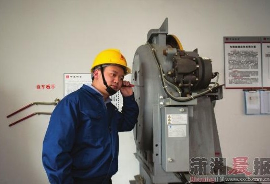 4月22日,中意一路中建大厦,维保人员正侧耳倾听电梯主机是否有异响。图/记者谢长贵