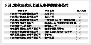 记者获悉,在广州市质监局发布的电梯困人“黑名单”中,广州市内9个小区单位物业被点名批评,其中,如意中心的广州东华物业管理有限公司因频发4次困人事件高居“榜首”,而富力广场的广州天力物业发展有限公司、北京路182号丽都大酒店裙楼的物管广州潮楼商业有限公司及广州市第一人民医院物业等8小区单位物管均因一个月内出现三次困人事件被点名。