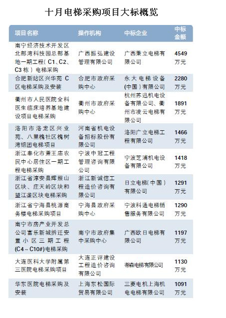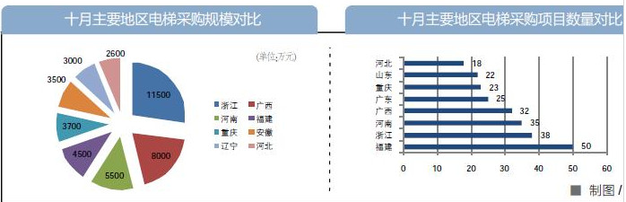 10月,电梯采购规模增幅较大,还有一个重要原因是医院类电梯项目增多,达到50个,其中千万元项目就有3个,这在以往非常罕见。