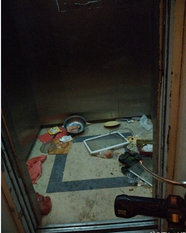 电梯轿厢里被堆满高层住户抛下的垃圾