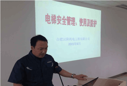合肥汉隆机电工程有限公司积极响应国家质检总局安徽省质检局组织的“电梯安全监管大会战”部署,落实市局大力加强安全宣传,强化保养期限内电梯正确管理、使用、故障处理、困人紧急救援机制,2015年6月18日在市电梯行业协会的指导下在科大智能电气技术有限公司联合开展“”的培训。 此次培训课生动活跃、互动交流、现场演练,让学员真正体验到了一次了解电梯安全知识的机会,培训进行了3个多小时于下午17:00圆满结束。