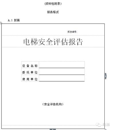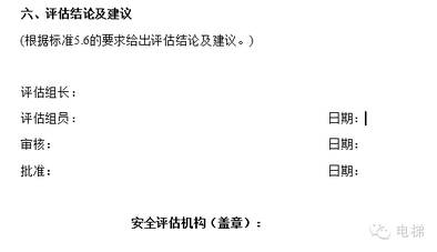 安全评估报告格式及主要内容参见附录A(资料性附录)。安全评估报告的结论页应当有安全评估、审核、批准人员的签字和安全评估机构检验专用章或者公章。安全评估报告中的电梯设备概况、综合分析内容与安全评估综合结论应当按照下述规定的内容描述: