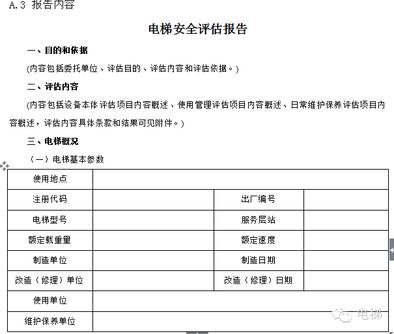 安全评估报告主要内容一般包括电梯安全评估目的和依据、评估内容、评估人员组成、电梯设备概况、评估过程及主要仪器设备、电梯安全评估技术分析、电梯安全评估综合结论等。安全评估报告可根据委托方的委托项目作相应调整。