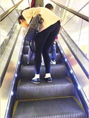 切勿在扶手梯上低头整理