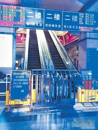 日前,记者在兰州火车站看到,候车大厅两部自动扶梯停止运转,上下扶梯口均用栏杆进行围挡。一楼电梯口左侧竖着一块蓝色的告示牌:“由于电梯检修,上二楼候车的旅客由左右楼梯上二楼。”