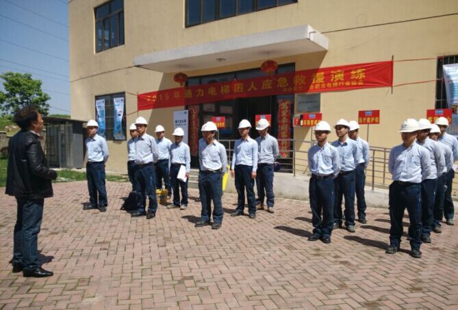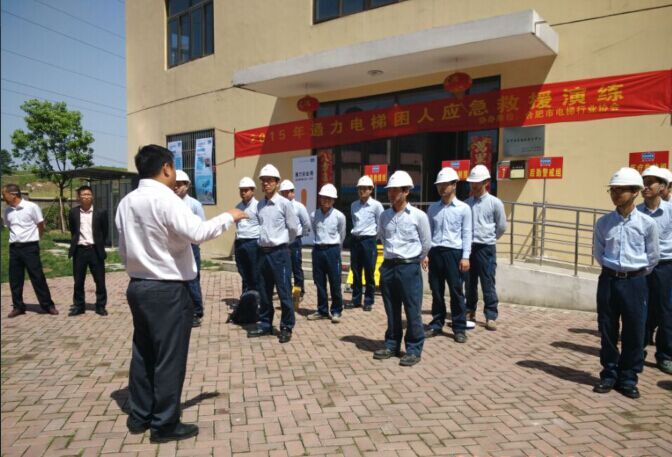 “报告,救援队明白。”立即按照既定方案到达指定地点,事故控制小组紧随应急救援小组其后,后勤警备组立即在楼道外安放警戒装置,引导无关人员撤离现场,并在一楼大厅安放相关应急物品。“报告,救援组已到达现场,经检查,机房门已锁闭,层门已全部锁闭护栏警示已安放到位,电梯现处于3层不平层位置,乘客无法立即放出,轿厢内有1名乘客被困,请指示!”,好,立即关闭层门,等候电源恢复,再对电梯进行系统检查。“收到,救援行动已结束,乘客都已安全放出,情绪稳定,电梯电源已恢复供电,现场正在检查电梯各部件。”指令声、应答声此起彼伏,一派实战景象。这不是仅有的一次,也不是通力独家演绎,近期合肥市多家电梯企业积极响应国家质检总局在全国组织的“电梯安全监管大会战”部署,落实市局大力加强电梯安全宣传、强化电梯紧急救援练兵活动,提高处置电梯事故应变能力指示精神,在市电梯协会的配合下进行的。市局将于6月中旬组织一次电梯应急演练活动。