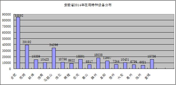 全省16市中合肥在用特种设备数量最多,为85092台(不含压力管道与气瓶,下同),占全省设备总量28.0%,其他设备过2万台的分别是芜湖(39192台)、马鞍山(34296台)。各市设备数量已全部超过5000台。