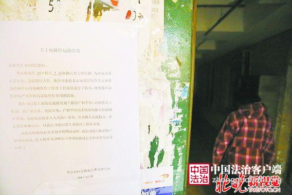 居民刘大妈住在15号楼的高层,她说,2015年12月28日上午,物业贴了一张“停梯告知书”,然后两部电梯被停了,这让大家感到措手不及。电梯停了,年轻人还能爬楼梯出行,老人就吃不消了,再加上楼道里的照明灯坏了不少,出门下楼就成了一件“不可能的事儿”。最让刘大妈着急的是,自己该去社区医院取药了,“可是下去了怎么上来呀?!”秦女士更担心元旦间的朋友聚会因此“泡汤”,“请了朋友来家里,这时停了电梯,真不方便。”