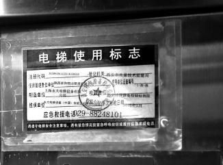 在其他的两部电梯里,张贴着盖有西安特种设备检验检测院印章的电梯使用标志,标志显示:登记机关是西安市质量技术监督局;使用管理责任单位是陕西祥和物业管理有限公司;制造单位是上海永大电梯设备有限公司;维保单位是永大电梯设备(中国)有限公司陕西分公司;检验单位是西安特种设备检验检测院;下次检验日期是2016年1月。