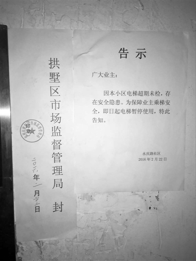 随后,记者在小区的单元楼电梯处也发现了“拱墅区市场监督管理局,2016年2月22日封”的封条。旁边还有社区2月22日张贴的告示:因本小区电梯超期未检,存在安全隐患。为保障业主乘梯安全,即日起电梯暂停使用。