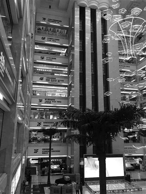 在围观市民的叹息声中,记者进入了该广场。说是广场,倒不如说是一个大型的商场,共有7层,商场中部中空,站在底下就能看到顶楼,四周则都是卖场,从大门进去,正对门就能看到大型的观光电梯,浅绿色的,共有三部。