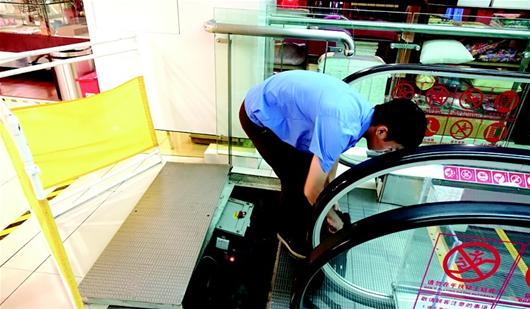 湖北日报讯 图为:工作人员正在对自动扶梯进行检查维修