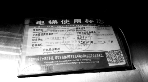 昨天下午,记者来到圣水苑小区。在3号楼的电梯里,记者看到,电梯年检证的“下次检验日期”为2016年3月,维保单位为沈阳蓝光电梯经销有限公司。