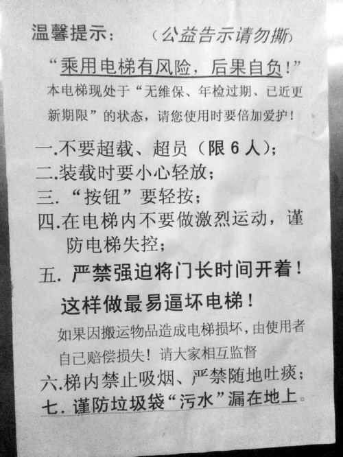 皇姑区黑龙江街新北花园小区8部电梯年检过期6个月,依然在“带病”工作。昨日,居民袁先生向沈阳晚报、沈阳网记者反映:“我们是弃管小区,电梯运行十多年了,一直没有进行大修。因为缺少维修费用,问题一直无法解决。”