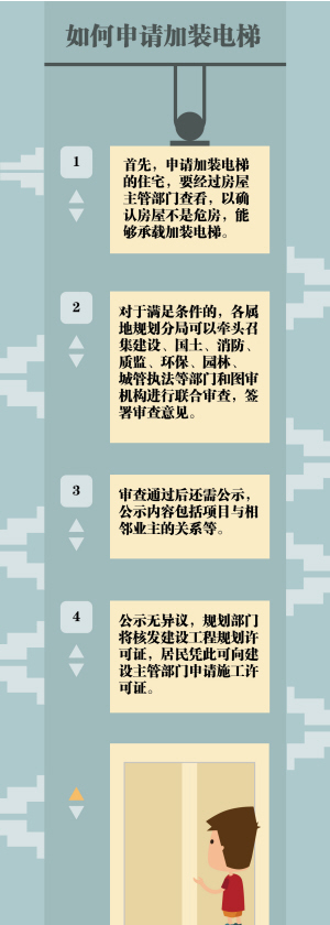 首先,申请加装电梯的住宅,要经过房屋主管部门查看,以确认房屋不是危房,能够承载加装电梯。对于满足条件的,各属地规划分局可以牵头召集建设、国土、消防、质监、环保、园林、城管执法等部门和图审机构进行联合审查,签署审查意见。“审查通过后还需公示,公示内容包括项目与相邻业主的关系等。”邓勇说,公示无异议,规划部门将核发建设工程规划许可证,居民凭此可向建设主管部门申请施工许可证。