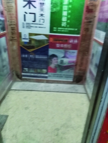 电梯防护板上各类广告以及乱写的广告,显得很乱。
