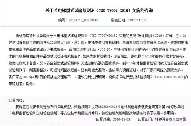 《电梯型式试验规则》(TSGT7007-2016,以下简称《规则》)已经于2016年7月1日起施行,为此质检总局特种设备局发布了《质检总局特种设备局关于《电梯型式试验规则》(TSGT7007-2016)实施的意见(质检特函〔2016〕27号)》(以下简称《质检特函〔2016〕27号》),做好《规则》的实施和过渡工作。