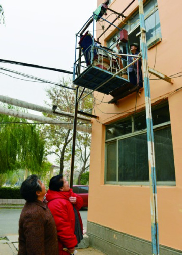 这位老人叫张英玺,今年79岁。2003年春节,相濡以沫的老伴突患老年痴呆症,张英玺一直守在老伴面前,细心照料。为了抚慰老伴的精神,每天带她下楼散心。为了妻子坐轮椅下楼方便,家住二楼的张英玺就琢磨着自造一部电梯。他设计了草图,大儿子帮他买来了电机,二儿子请来了“懂机械”的帮手,用了两天时间就把电梯造好了,张英玺的心愿实现了。“不管春夏秋冬,只要不是下雨下雪,我每天都用这个电梯带她下楼散散心。”现在,张英玺每天给老伴梳头、洗脸、换洗尿布。一日六餐、四杯水、一次药,都要用小勺来喂,一天600多勺。近十年来每天如此,照顾老伴成了张英玺的全部工作。在他细心照顾下,老伴从来没有患过一次感冒,常年卧床也没有褥疮,儿女们放心,邻居们称赞。