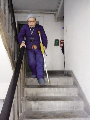 昨日上午,重庆晚报记者爬上10楼,见到了黄爷爷老两口。黄爷爷正拄着单拐在楼道里来回散步。“我左腿股骨头坏死,老伴也有退行性关节炎。”黄爷爷告诉记者,“以前电梯能用的时候,我坐轮椅下楼。现在下楼只能依靠拐杖一步步挪下去。”