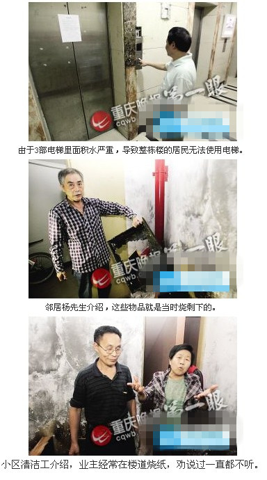 4月10日晚9时15分,沙坪坝土湾社区一居民楼内,两名年轻白领在楼道内烧纸,没想到触发开启消防自动灭火喷淋系统,水势滂沱,一直喷洒了近两个小时。不仅楼道内积水严重,就连整幢楼的3部电梯进水后也出现故障,全部停用。目前事故已过去3天,但全楼的384户居民,每天仍要爬上爬下这样的日子,大家不晓得要到哪天才能结束?