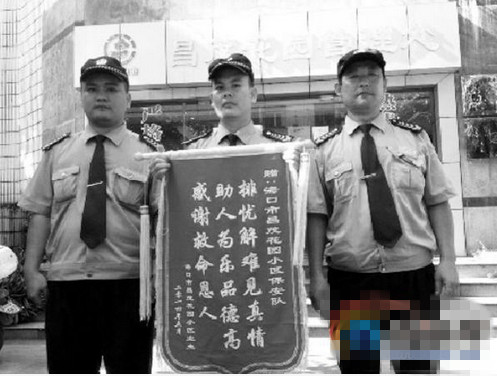 “哎呀,这样子的小事,是我们该做的,帮助别人我们自己也很快乐。”黎多剑说。接到锦旗的3位值班的保安,很是腼腆。这已不是他们第一次帮助住户救急。