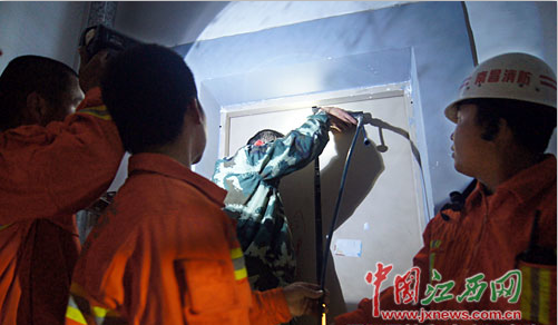 出动所有的执勤力量赶赴现场营救。为了节约时间,消防官兵只得采用手动液压剪扩器对电梯门进行