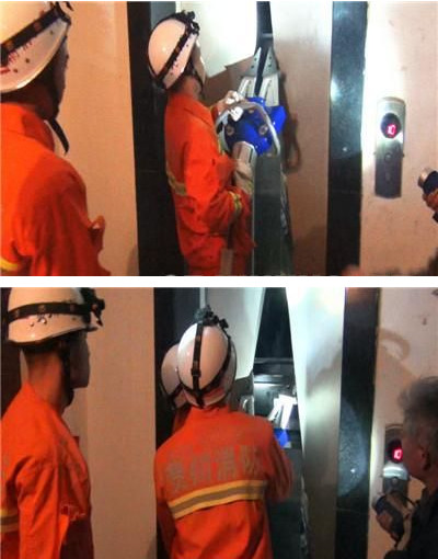 到达现场后,经指挥员勘察和询问物业工作人员后得知电梯突然发生故障,停在10楼与11楼中间,而且电梯内的两名人员已经被困一个小时许,情况十分紧急。了解情况况后,消防官兵先利用撬棍将电梯门撬开缝后用液压扩张器等工具对电梯进行破拆,破拆的同时与被困人员交谈,稳住被困人情绪。经过将近20多分钟的救援,被困人员被成功救出。