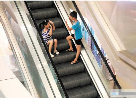 在商场里,一些孩子将扶梯当成了“游乐场”。
