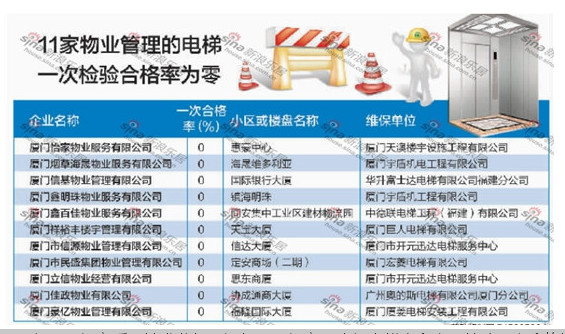 记者了解到,厦门市电梯使用单位为物业管理单位的共有164家,上半年完成定期检验的4360台,一次合格率为87%,略高于全市总体一次合格率。其中,一次合格率低于75%的物业管理单位有33家。记者注意到,管理国际银行大厦电梯的厦门信基物业管理有限公司、管理镇海明珠电梯的厦门鑫明珠物业服务有限公司以及管理天宝大厦的厦门祥裕丰楼宇管理有限公司等11家物业管理单位电梯定期检验一次合格率为0(详见表格)。