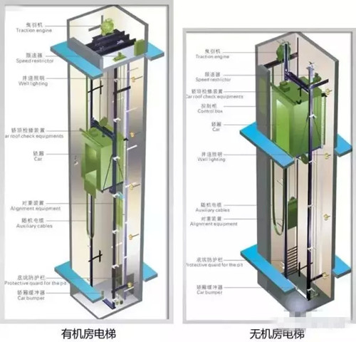无机房电梯是相对于有机房电梯而言的,也就是说,利用现代化生产技术将机房内设备尽量在保持原有性能的前提下小型化,省去了机房,将原机房内的控制柜、曳引机、限速器等移往电梯井道顶部或井道侧部,从而取消了传统的机房。以便满足客户对高度和屋顶的特殊要求。