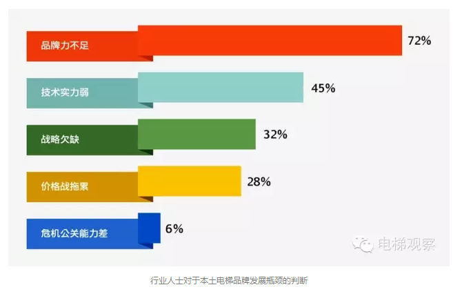 不可回避的一个事实是,面对国外企业大刀阔斧的中国战略推进,中国本土企业的市场地位提升一时受阻。在格林市场研究室的调研结果中,绝大多数人认为“品牌力不足”仍然是制约本土企业进一步发展的首要因素,特别是在当前,房地产行业的严重分化致使开发商更加关注电梯品牌;此外,“技术实力弱”致使本土企业遭遇发展天花板的原因,特别是在“核心技术的缺乏让本土企业很难在高端项目上胜出”。甚至,“小农经济”思想的作祟下,远大战略的缺失很容易让过去几年中国本土企业来之不易的成果受损。