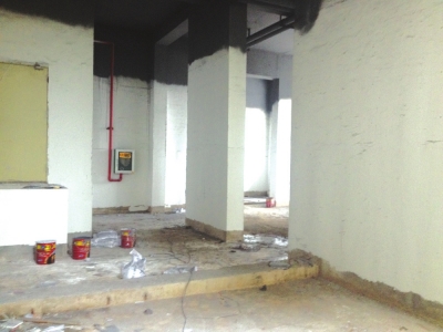 记者在小区6栋的架空层看到,有一部分水泥地面已经铺上了地砖,墙壁刷上了白色石灰,现场还有3名工人在施工。现场一名工人告诉记者,他们施工一个多月了,但未听说过这里要建宿舍和食堂。